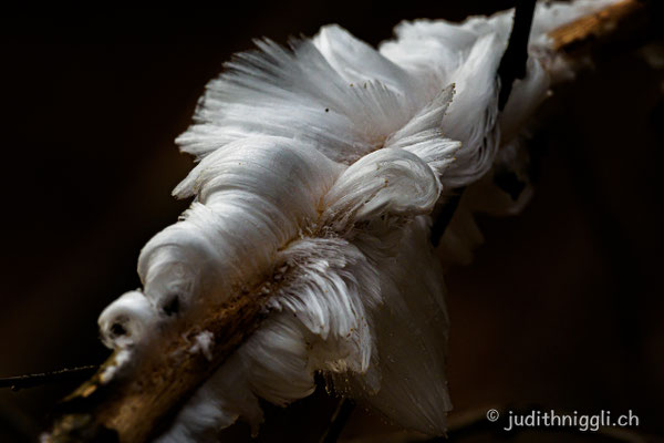 Hauptverantwortlich ist aber die rosagetönte Gallertkruste (Exidiopsis effusa). Ein winteraktiver, atmender Baumpilz. Die Gase seines Stoffwechsels verdrängen das im Totholz vorhandene, leicht unterkühlte Wasser an die Oberfläche. Dort gefriert es zu Eis und wird durch nachdrängendes, beim Austritt aus den feinen Holzporen ebenfalls gefrierendes Wasser, weitergeschoben. Die Moleküle des zersetzten Holzes bilden im Eis eine Art Gerüst, damit bleiben die Fäden stabil und können auch mal über mehrere Tage bestehen. Wird aber die Luft zu trocken, löst sich das Haareis in Wasserdampf auf.