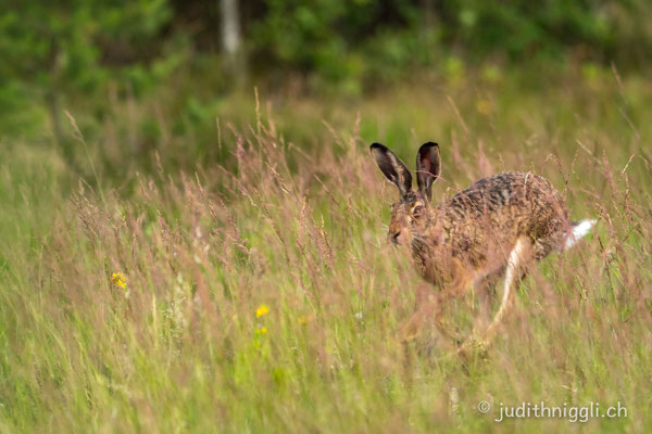 Das Stummelschwänzchen der Feldhasen ist auf der Unterseite weiss - oben schwarz, bei den Schneehasen sind beide Seiten weiss.